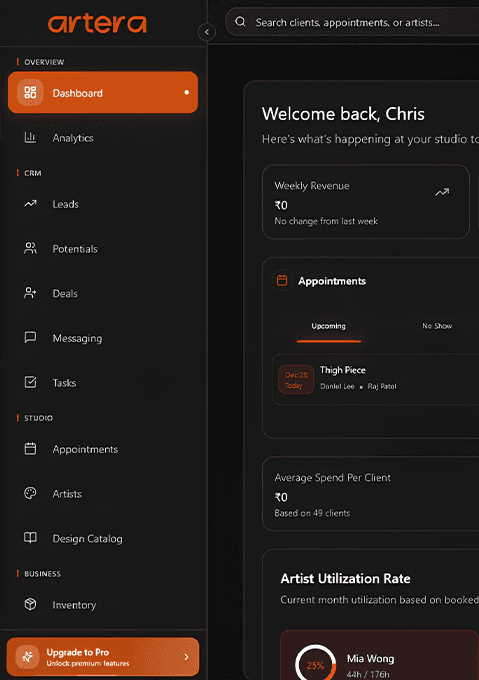 Arterabuildstheoperationallayerfortattoostudioscombiningclientmanagement,scheduling,communication,andpaymentsintoasingle,reliablesystem.
