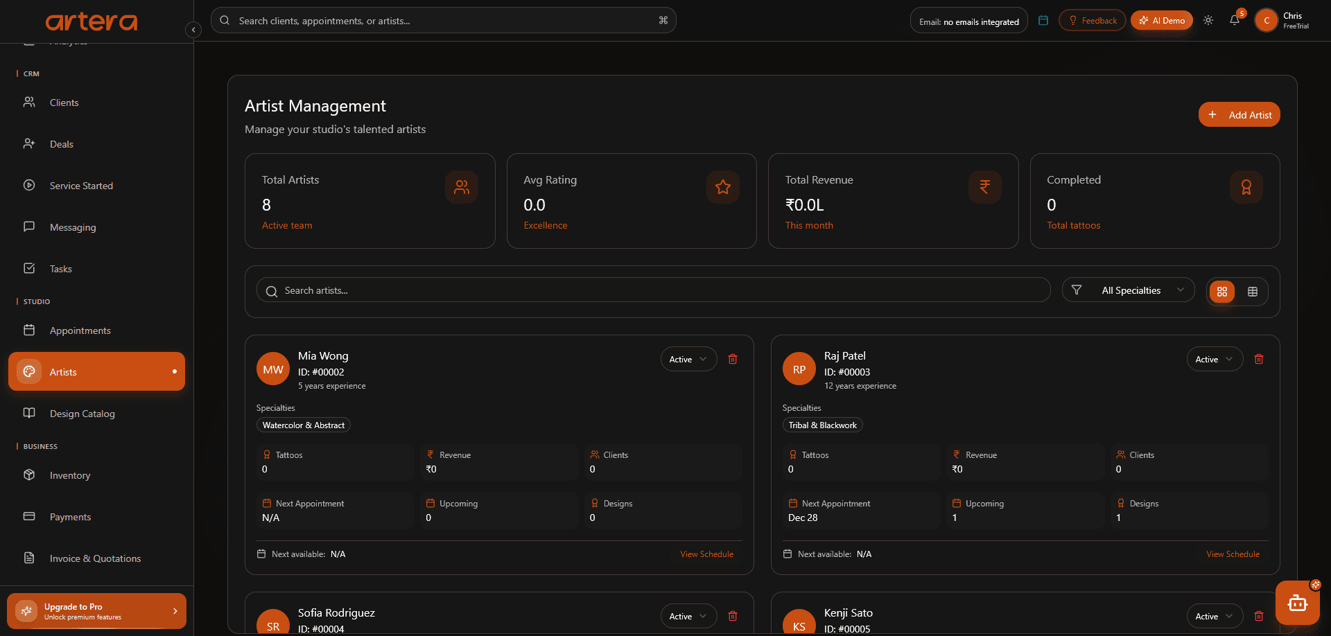 Artera replaces chaos with clarity. It reduces manual work, eliminates scattered tools, and brings consistency to studio operations. Artists spend less time managing admin and more time focusing on their craft. Clients experience smoother communication, professionalism, and reliability.