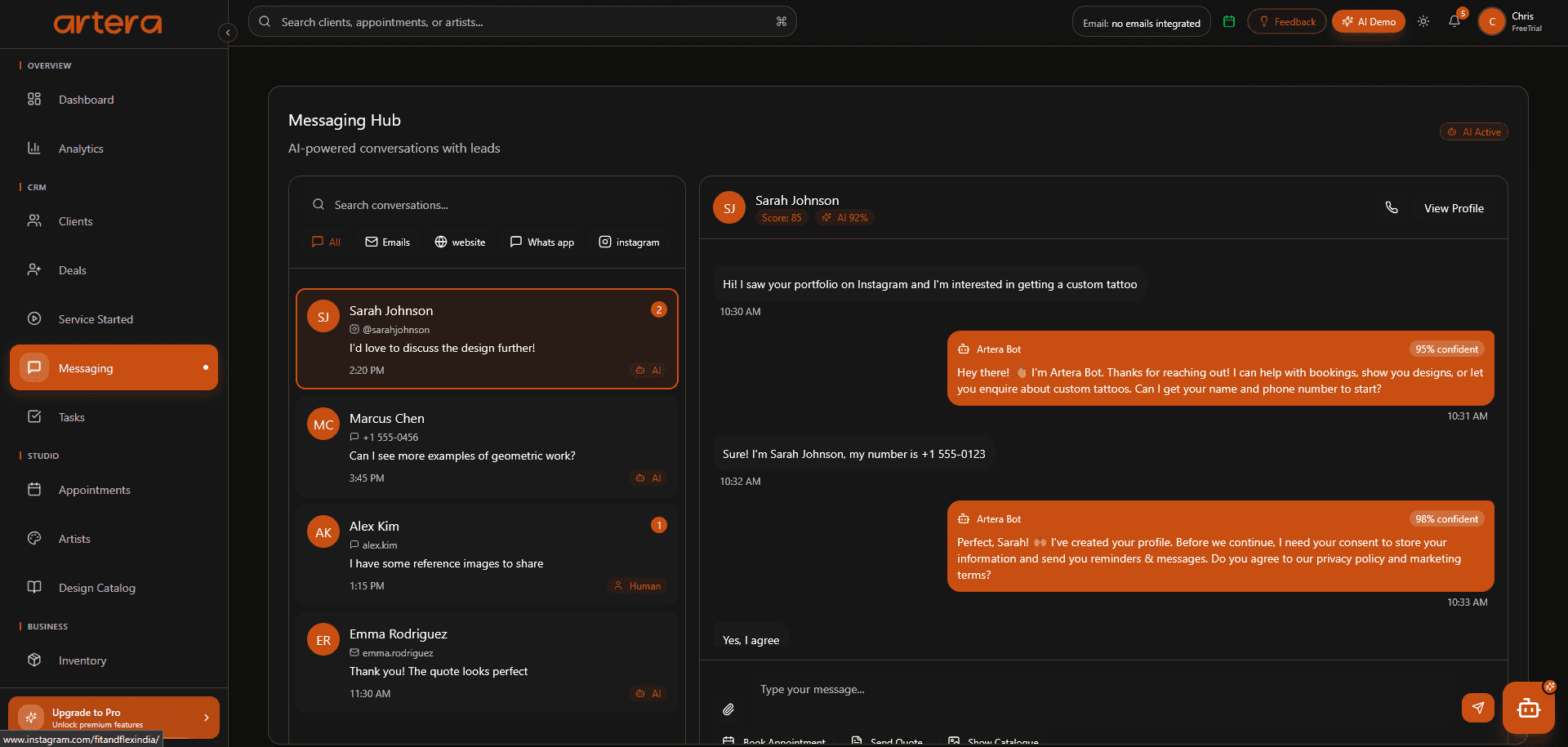 Artera CRM centralizes client information, conversations, bookings, and studio workflows into one intuitive system. It eliminates the need for scattered tools, reduces manual follow-ups, and ensures every interaction is organized and accessible. Built with security and simplicity at its core, Artera CRM helps studios operate professionally while allowing artists to stay focused on what matters mosttheir craft.