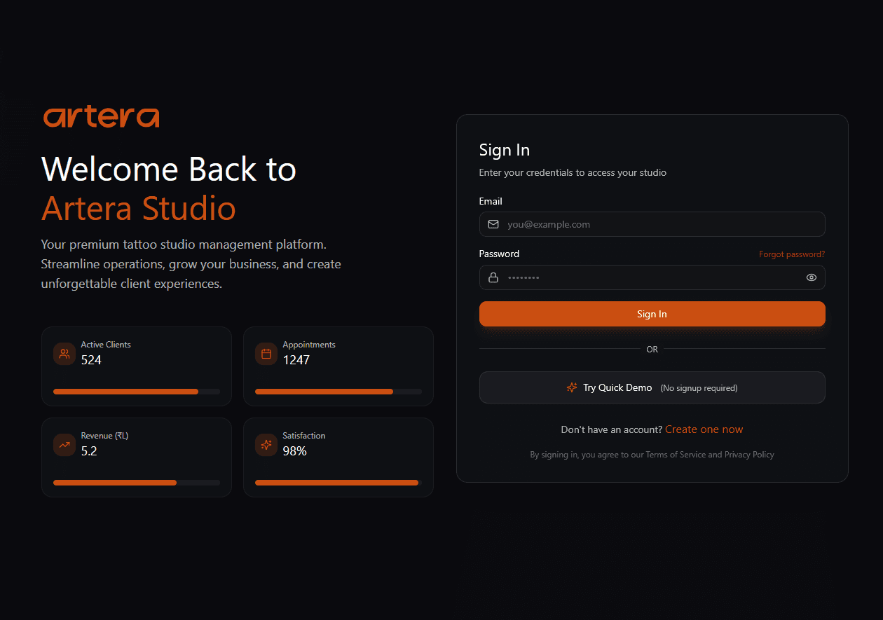 Artera’s sign-in experience is built to establish trust from the very first interaction. By combining secure, encrypted access with a simple, intuitive sign-up flow, the system removes friction while protecting what matters most studio data. Every decision is designed to reassure users, streamline access, and create confidence in the platform from day one. The result is a sign-in experience that feels safe, effortless, and aligned with how modern studios work.